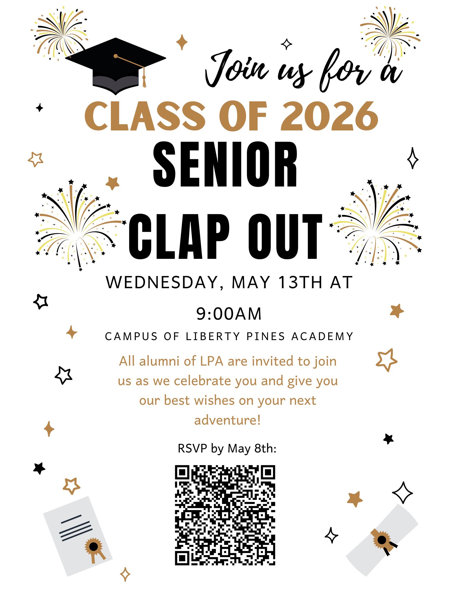 - Liberty Pines Academy – May 13 at 9 am. Seniors should wear their cap & gowns. Click HERE for all information and to RSVP