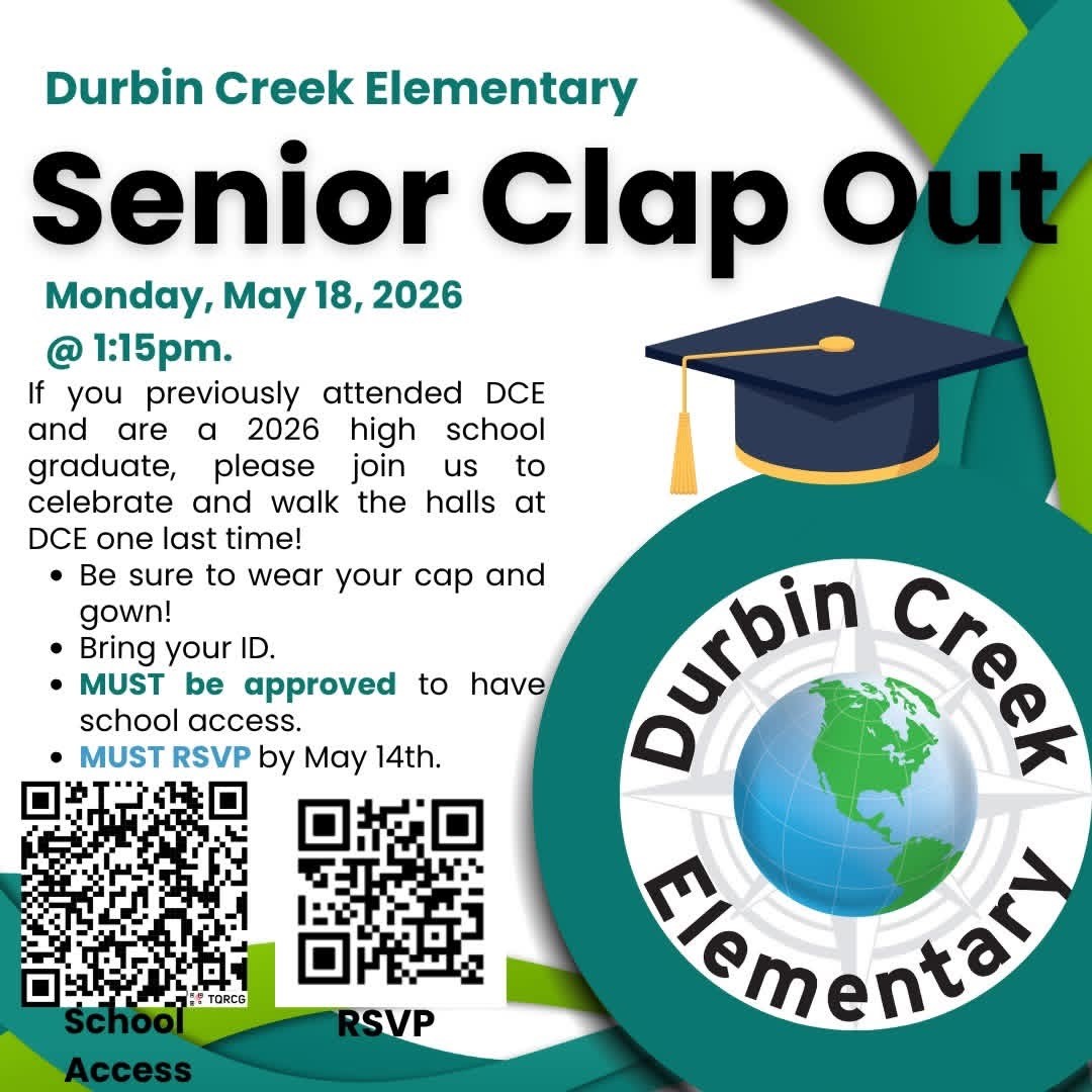 - Durbin Creek Elementary – May 18 at 1:15 pm. Click HERE for all information and to RSVP