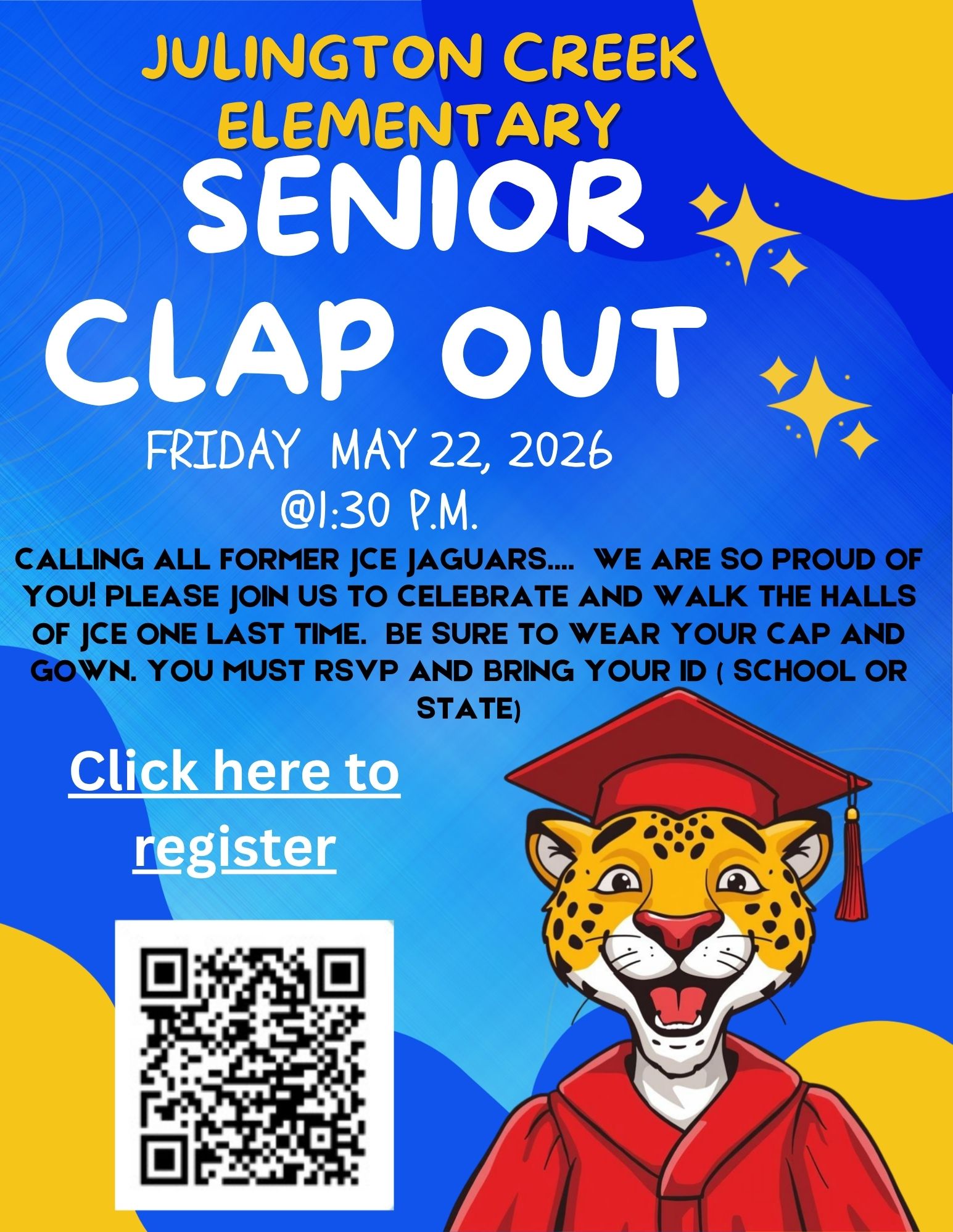 - Julington Creek Elementary – May 22 at 1:30 pm. Click HERE for all information and to RSVP